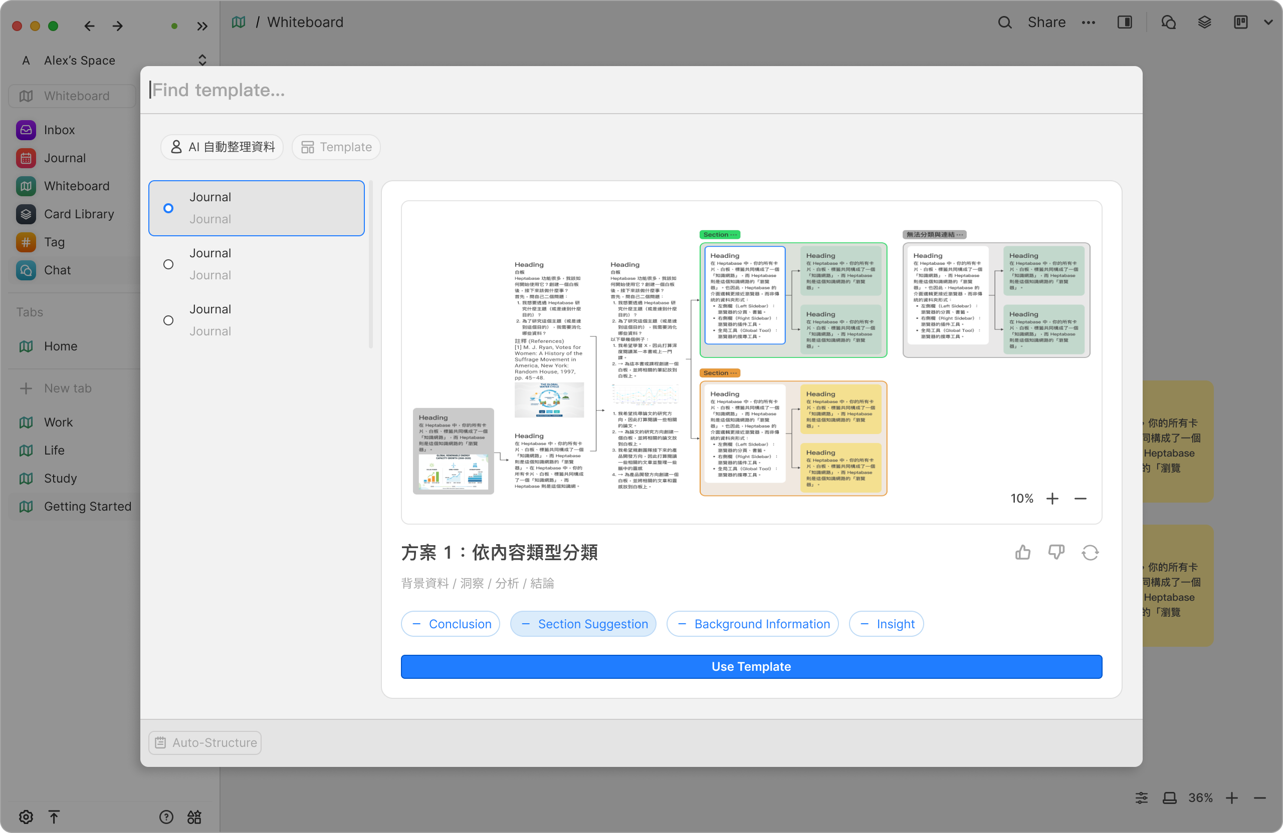 When the whiteboard becomes crowded with cards, connections, and screenshots, the AI Context Architect reads the existing content and proposes possible structures and relationships. It quickly transforms scattered information into a clear, organized hierarchy.